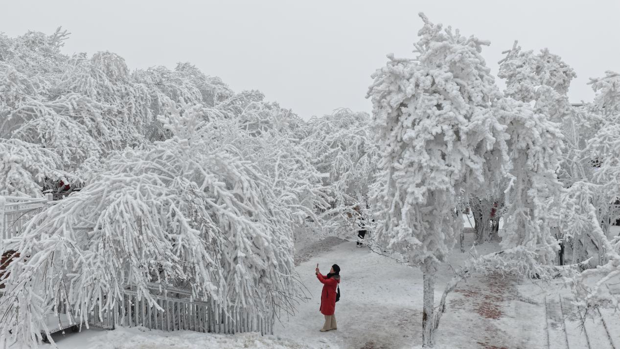 1月23日,汉中龙头山漫山雾凇凝霜挂玉,游客穿行其间,沉浸式体验冰雪仙境的独特魅力。(宋晓丽 摄)