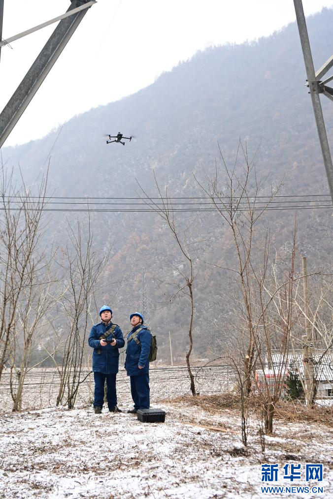 1月29日,国网宝鸡供电公司输电运检中心秦岭输电运维班班长周红亮(左)、副班长令云在宝鸡市凤县黄牛铺镇东河桥村附近使用无人机检查线路覆冰情况。新华社记者 邹竞一 摄pagebreak