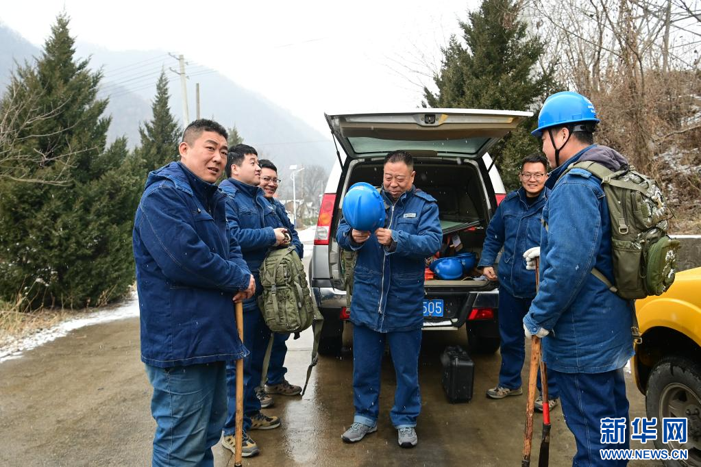 1月29日,国网宝鸡供电公司输电运检中心秦岭输电运维班班长周红亮(前)、副班长令云(中)、副班长薛龙在宝鸡市凤县黄牛铺镇东河桥村附近进行线路覆冰巡检。新华社记者 邹竞一 摄pagebreak