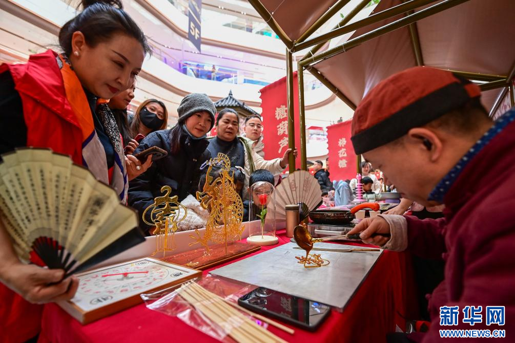 2月7日,游客在活动现场观看糖画制作。