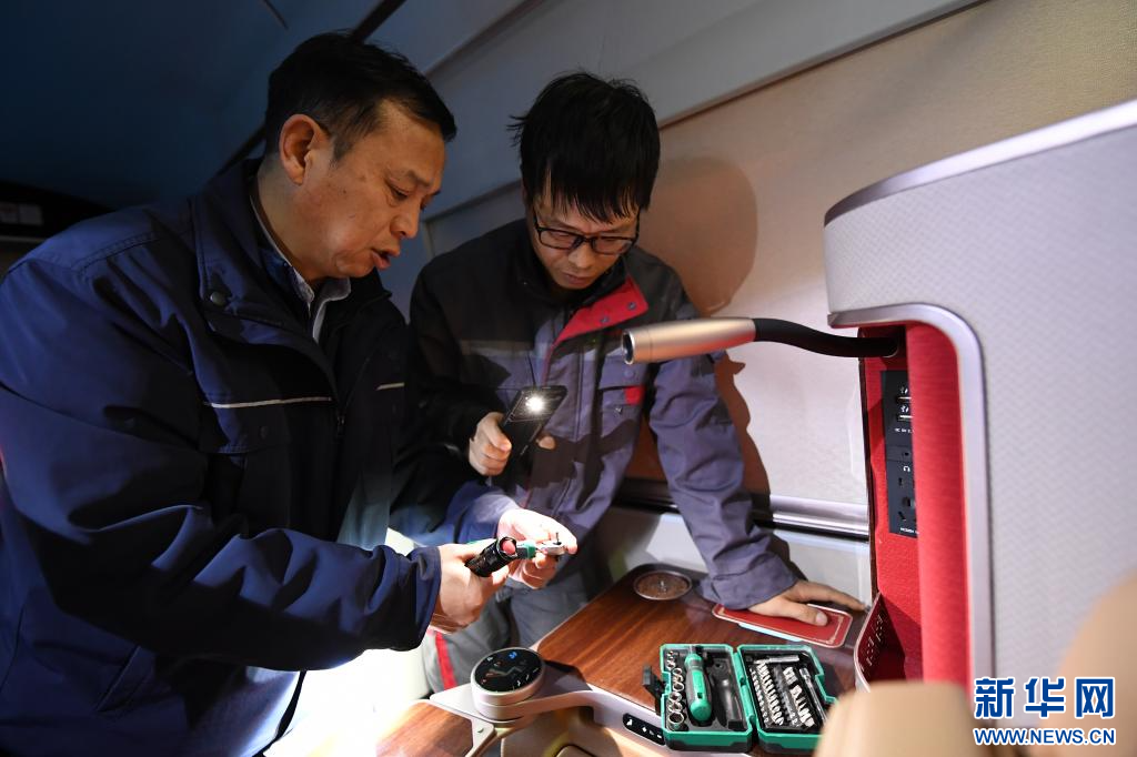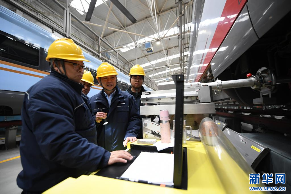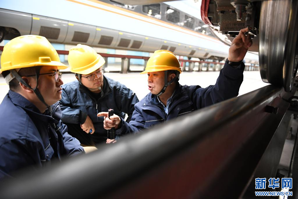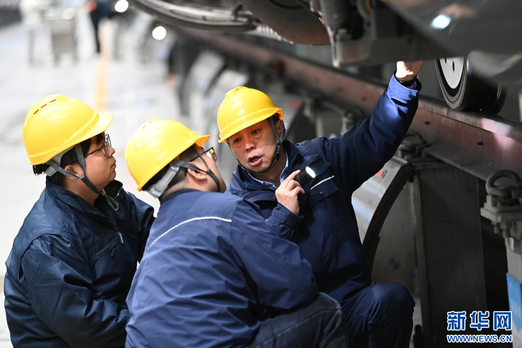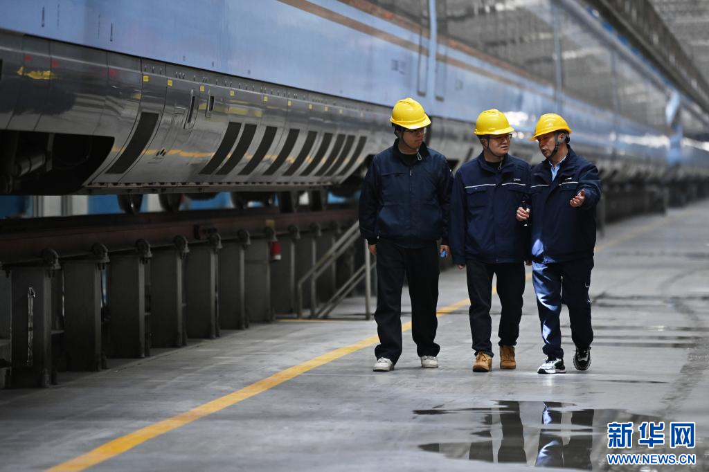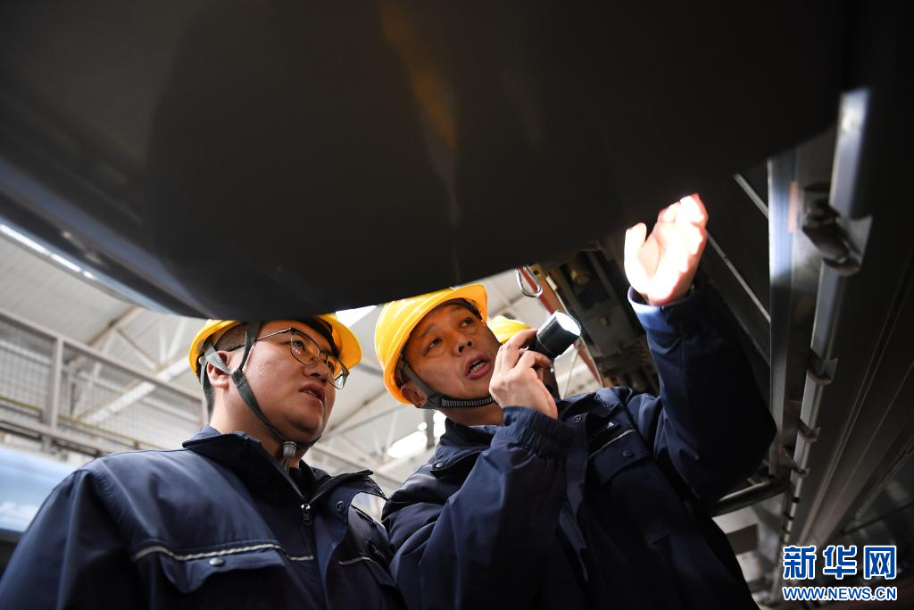 1月14日,在位于中国铁路西安局集团有限公司西安动车段的动车组检修库,董宏涛(右)和青年职工一起检修动车组列车。