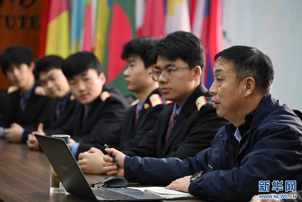2月4日,董宏涛(右一)在位于陕西省渭南市的陕西铁路工程职业技术学院和学生交流。