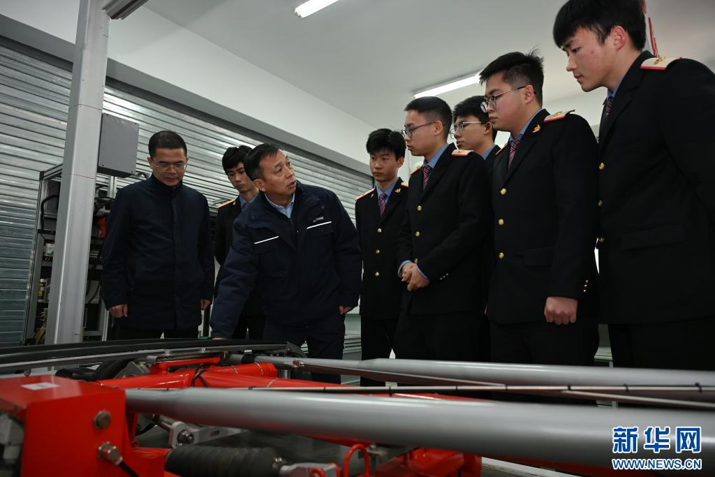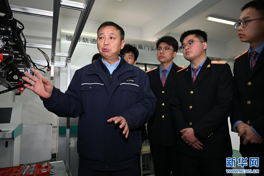 2月4日,在位于陕西省渭南市的陕西铁路工程职业技术学院实训室,董宏涛(左三)与师生交流。