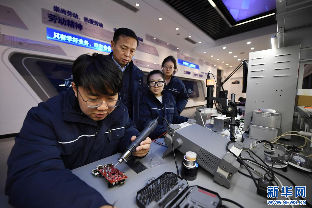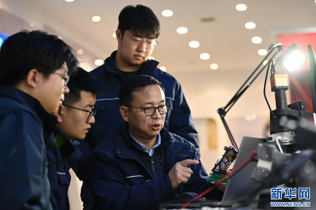 2月4日,在位于陕西省渭南市的陕西铁路工程职业技术学院实训室,董宏涛(前左一)为学生指导业务。