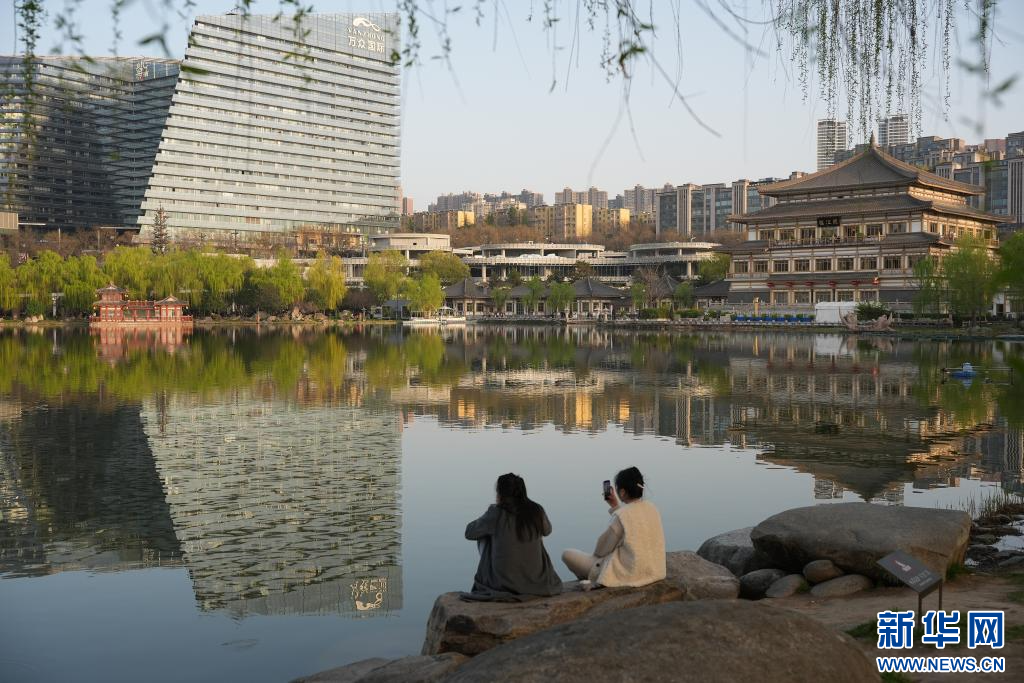 3月24日,游人在西安曲江池遗址公园赏景、拍照。
