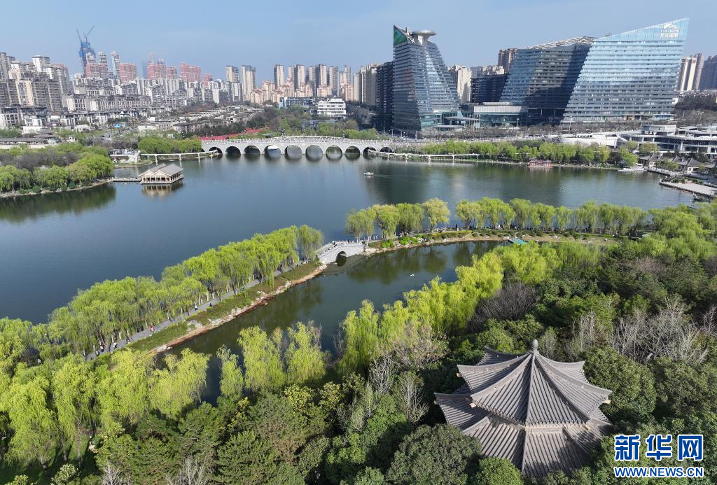 西安曲江池遗址公园景色(3月24日摄,无人机照片)。