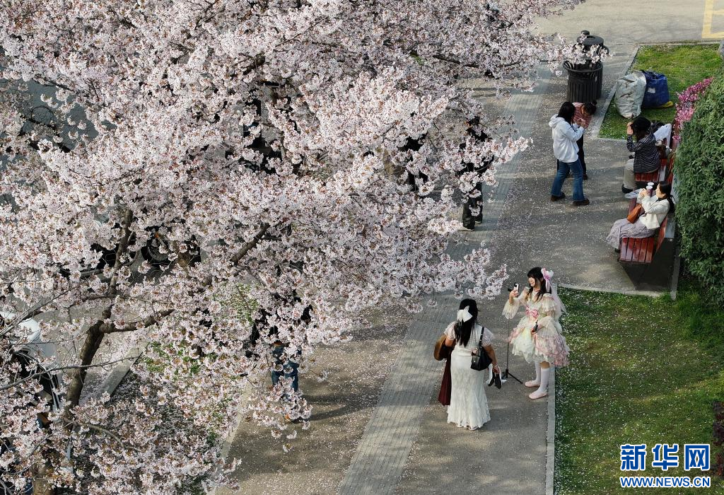 3月24日,游人在西安市雁塔区曲江池西路的樱花树下拍照、游玩(无人机照片)。