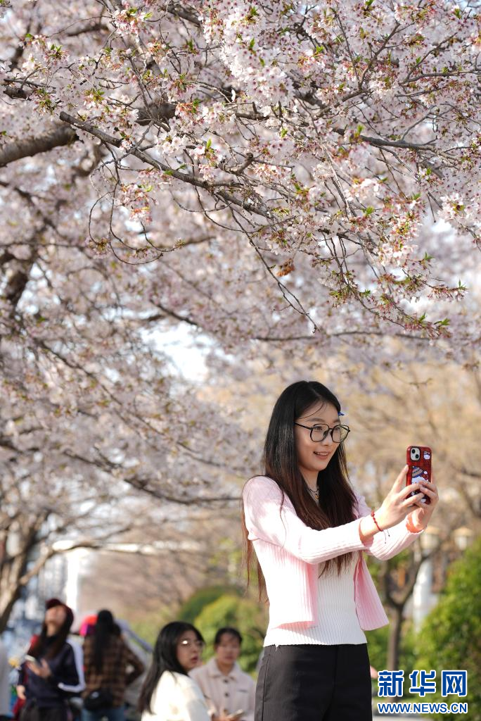3月24日,游人在西安市雁塔区曲江池西路的樱花树下拍照。