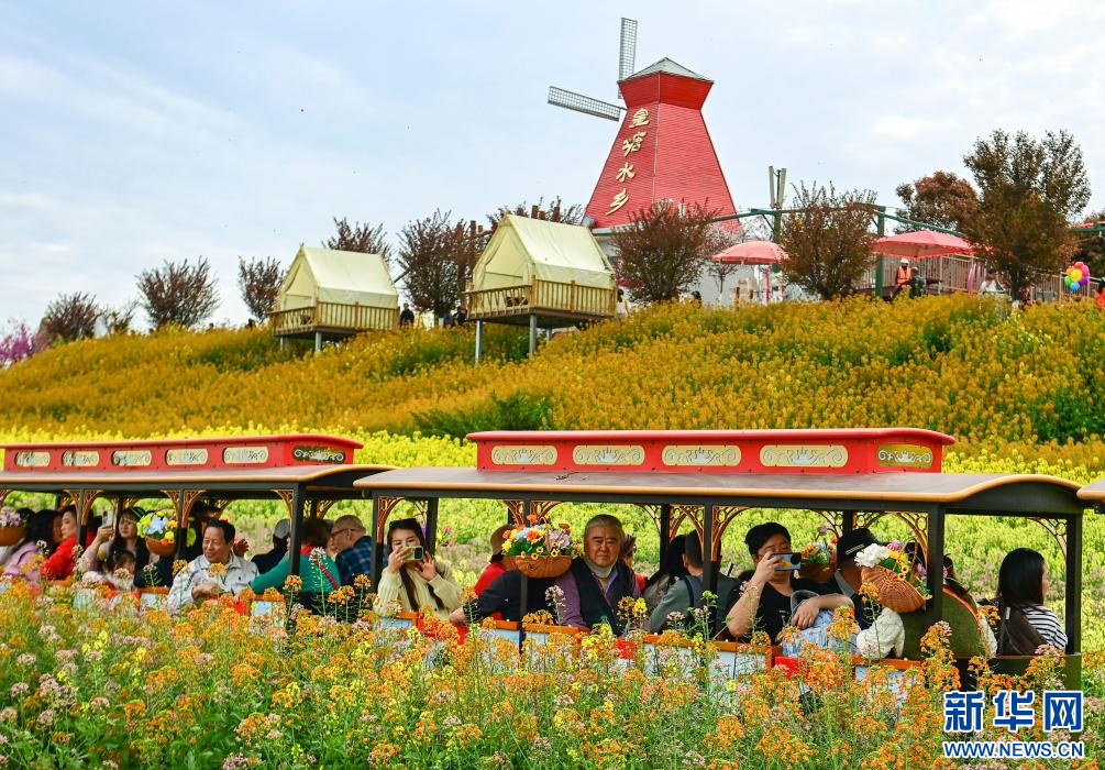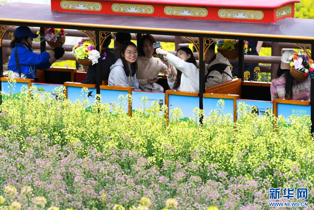 3月27日,游客在汉中市汉台区老君镇黄塘村黄塘水乡景区乘坐小火车观光。