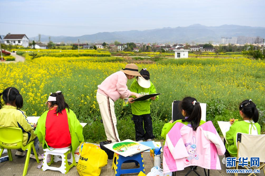 3月28日,学生在汉中市西乡县杨河镇高土坝社区油菜花观花点写生。