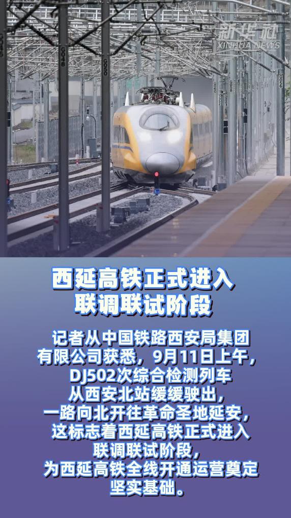记者从中国铁路西安局集团有限公司获悉,9月11日上午,DJ502次综合检测列车从西安北站缓缓驶出,一路向北开往革命圣地延安,这标志着西延高铁正式进入联调联试阶段,为西延高铁全线开通运营奠定坚实基础。